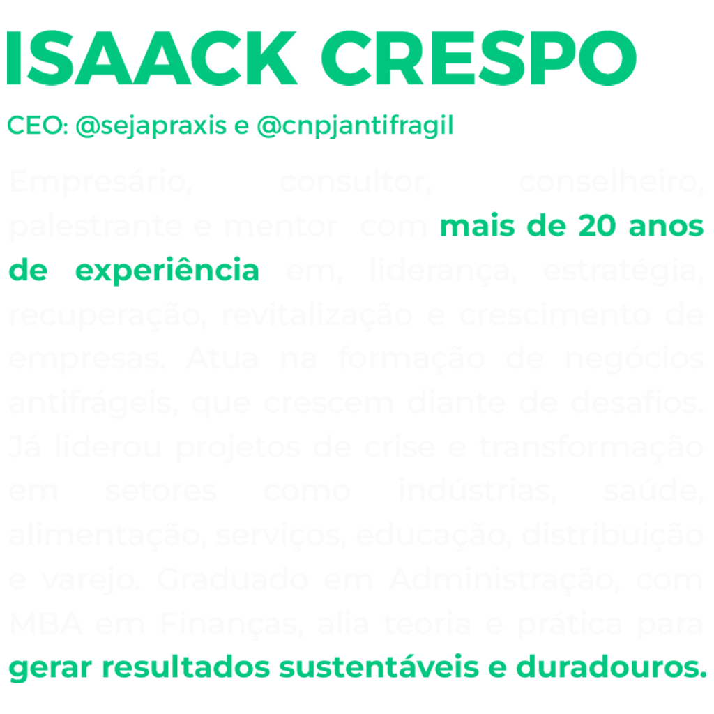 Empresário, consultor, conselheiro, palestrante e mentor com mais de 20 anos de experiência em, liderança, estratégia, recuperação, revitalização e crescimento de empresas. Atua na formação de negócios antifrágeis, que crescem diante de desafios.